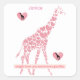 As cores principais do design são salmão e preto. O elemento principal é uma girafa feita com corações. O nome é personalizável.