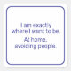 Este adesivo é uma vibração. Use-o para declarar sua preferência por uma solidão pacífica. O texto azul escuro diz, "Estou exatamente onde quero estar. Em casa, evitando pessoas." Outras cores disponíveis incluem rosa quente, vermelho escuro, preto e verde escuro.