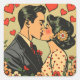 Beijos bonitos de casal do século médio, rodeados de corações de pop, feitos no estilo de quadrinhos.