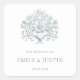 Adesivo Quadrado de Casamento Barroco Azul Empoeirado Elegante Vintage. Um adesivo quadrado de casamento sofisticado clássico com ilustrações azuis empoeiradas vintage em fundo branco. É ideal para celebrações de casamento elegantes em estilo clássico.