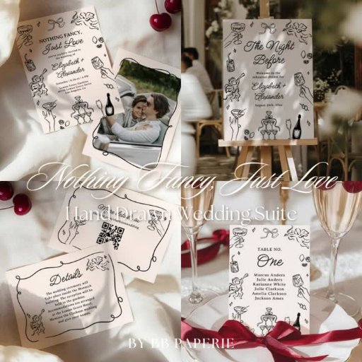 Este jogo de papelaria de casamento romântico traz um charme alegre para o seu grande dia. O tema "Nada de Rico, Apenas Amor - Quirky e Whimsical" apresenta ilustrações desenhadas à mão de óculos picantes, figuras dançarinas e torradas de champanhe - tudo numa arte divertida, em estilo de esboço. Com sua elegância casual e um toque de humor, este papel de bom captura a vibração de casais que querem algo de dedo, cheio de personalidade, e totalmente. Perfeito para celebrações modernas que são mais sobre amor do que tradição.