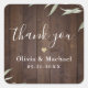 Fundo moderno de água-viva botânica com folhas verdes em madeira escura, "obrigado" em letra moderna com nomes do casal e data do evento, simples e elegante, ótimas etiquetas personalizadas para casamento rústico botânico no outono e inverno.