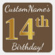 Adesivo Quadrado Castanho, Faux Dourado 14 Aniversário + Nome Perso