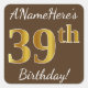 Este simples design de aniversário apresenta uma mensagem como "ANameHere's 39th Birthday!", com o "39º" a ter uma aparência de cor falsa/imitada inspirada em ouro, num fundo de cor castanha. O nome pode ser personalizado. Os adesivos como estes podem talvez ser um presente para alguém que comemora os seus trinta e nove anos, ou talvez possam ser usados como decorações numa festa de aniversário. [~Z0000249]