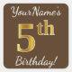 Este simples design de aniversário apresenta uma mensagem como "O 5 de Aniversário do Vosso Nome!", com o "5" a ter uma aparência falsa/imitada de cor inspirada em ouro, num fundo de cor castanha. O nome pode ser personalizado. Os adesivos como estes poderiam talvez ser um presente para alguém que comemora o seu quinto aniversário, ou talvez pudessem ser usados como decorações numa festa de aniversário. [~Z0000249]
