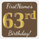 Este simples design de aniversário apresenta uma mensagem como "63º Aniversário do Primeiro Nome!", com o "63º" a ter uma aparência falsa e imitada de cor inspirada em ouro, num fundo de cor castanha. O nome pode ser personalizado. Os adesivos como estes poderiam talvez ser um presente para alguém que comemora o seu sessenta terceiro aniversário, ou talvez pudessem ser usados como decorações numa festa de aniversário. [~Z0000249]