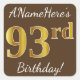 Este simples design de aniversário apresenta uma mensagem como "ANameHere's 93rd Birthday!", com o "93º" a ter uma aparência de cor falsa/imitada inspirada em ouro, num fundo de cor castanha. O nome pode ser personalizado. Os adesivos como estes poderiam talvez ser um presente para alguém que comemora o seu 90.º aniversário, ou talvez pudessem ser usados como decorações numa festa de aniversário. [~Z0000249]