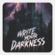 Um gráfico vertical dramático que apresenta um castelo gótico em torre, silhuetado ou mansão sob uma tempestade furiosa. Fortes rachaduras laranja e roxas de raios através do céu escuro, destacando a estrutura imponente. O texto "WRITE YOUR DARKNESS" é exibido com destaque em uma fonte em negrito, gotejando, no estilo de horror.