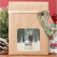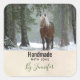 Feita à mão com adesivos de amor com uma fotografia de um cavalo marrom com um mano branco longo e esfregado. Em pé em uma floresta com flocos de neve caindo por toda parte.