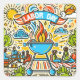 Celebre o Dia do Trabalho com esta placa vibrante com uma animada cena de churrasco ao ar livre. No centro, uma grande grelha azul com chamas dançarinas e o texto em negrito "LABOR DAY" serve como ponto focal. Ao redor da grelha, as pessoas são representadas aproveitando a companhia umas das outras, sentando-se em cobertores de piquenique e participando de conversas. O fundo é adornado com raios solares, nuvens e estrelas, somando à atmosfera festiva deste feriado especial que honra as contribuições dos trabalhadores.
