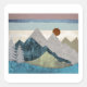 Paisagem moderna com cores e padrões únicos mostrando uma paisagem de montanha com uma linha do horizonte estriada.