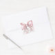 Um grande adesivo de laço rosa charmoso com um adorável laço rosa bebê em aquarela ao fundo. O design inclui um leve gradiente na parte inferior que desaparece suavemente, criando um visual elegante e suave. No topo, exibe o nome da futura mamãe ou noiva, e abaixo, em fonte serifada clássica, a data do chá. No centro, ao lado do laço rosa, está "Obrigado!" em caligrafia manuscrita elegante.