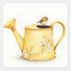 A delightful and whimsical illustration featuring a pastel yellow watering can. The can is beautifully decorated with delicate white and pink flowers and green leafy vines, creating an elegant floral pattern. Perched gently on the opening of the watering can is a small, adorable robin bird, with its characteristic red breast and inquisitive look. Rendered in a soft, watercolor-like style, this charming image evokes themes of gardening, spring, nature, and tranquility. Isolated on a clean white background, it's perfect for greeting cards, nursery decor, gardening blogs, or any project needing a touch of sweet, rustic charm.