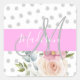Vinheta quadrada de monograma chic e cinza com primavera floral rosa e pêssego e um fundo branco com bolinhas de cinza. Seu nome personalizado e monograma são escritos em um elegante roteiro branco e cinza com letras de mão com um fundo rosa. Você pode alterar a cor do texto, o estilo e o tamanho da fonte usando a opção personalizar.