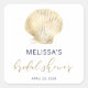 Este adesivo elegante para chá de noiva apresenta uma ilustração vintage de uma concha de vieira em folha de ouro falso, acima das palavras "chuva de noivas" em elegante letra manuscrita dourada. Personalize o restante do texto com o nome da noiva e a data do chá em azul marinho.