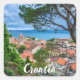 Vista da pequena cidade de Omis rodeada de montanhas, rio Cetina e mar, Makarska Riviera, Croácia. Vista do pinheiro, centro da cidade com telhados vermelhos e azul.