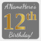 Este simples design de aniversário apresenta uma mensagem como "ANameHere's 12 Birthday!", com o "12" a ter uma aparência de cor falsa/imitada inspirada em ouro, sobre um fundo colorido de cinza (cinza). O nome pode ser personalizado. Os adesivos como estes poderiam talvez ser um presente para alguém que comemora o seu décimo segundo aniversário, ou talvez pudessem ser usados como decorações numa festa de aniversário. [~Z0000250]