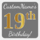 Adesivo Quadrado Cinzas, Faux Dourado 19º Aniversário + Nome Person