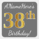 Este simples design de aniversário apresenta uma mensagem como "ANameHere's 38th Birthday!", com o "38º" a ter uma aparência de cor falsa/imitada inspirada em ouro, sobre um fundo colorido de uma cinza (cinza). O nome pode ser personalizado. Os adesivos como estes podem talvez ser um presente para alguém que comemora os seus trinta e oito anos de aniversário, ou talvez possam ser usados como decorações numa festa de aniversário. [~Z0000250]