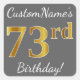 Este simples design de aniversário apresenta uma mensagem como "CustomName’s 73rd Birthday!", com o "73º" a ter uma aparência de cor falsa/imitada inspirada em ouro, em uma cinza (cinza) colorida de fundo. O nome pode ser personalizado. Os adesivos como estes poderiam talvez ser um presente para alguém que comemora o seu setenta e terceiro aniversário, ou talvez pudessem ser usados como decorações numa festa de aniversário. [~Z0000250]