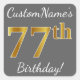 Este simples design de aniversário apresenta uma mensagem como "CustomName’s 77th Birthday!", com o "77º" a ter uma aparência de cor falsa/imitada inspirada em ouro, em uma cinza (cinza) colorida de fundo. O nome pode ser personalizado. Os adesivos como estes podem talvez ser um presente para alguém que comemora o seu setenta e sete anos, ou talvez possam ser usados como decorações numa festa de aniversário. [~Z0000250]