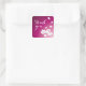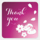 Um conjunto personalizável de adesivos quadrados roxos "Obrigado" com uma ilustração de dois coelhos de neve, duas flores de sakura, e quatro pétalas de flor de sakura contra um fundo roxo no canto inferior direito. As palavras "Obrigado" são personalizáveis.
