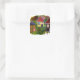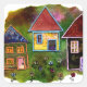 Arte de Marta Harvey. As casas foram criadas com papéis pintados feitos com técnicas diferentes e revestidos com canetas de gel. O fundo foi feito com toalhas de papel pintadas. As flores foram feitas com um furo redondo perfurado sobre papéis pintados e depois as pétalas, folhas e caules desenhados com caneta e tinta.