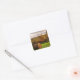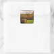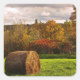 Estes adesivos de fotografia de arte apresentam uma paisagem de outono adorável em cores de folhagem sazonais de vermelho, laranja, amarelo, marrom e verde. Uma tempestade passou e o sol está se quebrando através das nuvens em um campo de coroa com fardos redondos de feno.