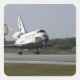 Com a calha de arrasto descontinuada, a descoberta do ônibus espacial pousa na pista 33 no Shuttle Landing Facility no Kennedy Space Center, na Flórida, em destaque com Cape Canaveral.