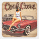Vintage-style of a sultry in a sleek white mini dress posing seductively beside a gleaming red classic convertible sports car.