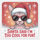 Celebrate Christmas with attitude! This fun design features a stylish Sphynx cat wearing Santa’s hat and cool sunglasses, paired with the playful quote “Santa said I’m too cool for fur!” Perfect for Sphynx lovers and cat enthusiasts who adore humor and holiday cheer. Add a unique twist to your festive season with this trendy, hairless cat Christmas artwork. Ideal for apparel, cards, and home décor.