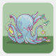 Uma ilustração engraçada ao estilo cartoon de um polvo usando seus tentáculos para fazer um quadrado peggy de crochê. O polvo também tricota com agulhas de tricô. Um design para quem ama artesanatos, especialmente crochê.