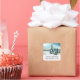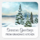Etiquetas de cozinha com uma bela pintura a aquarela. Pinheiros cobertos de neve numa cena do inverno. Flocos de neve caindo em um chão coberto de neve. Nuvens brancas e azuis fluffy no céu. Com um lago congelado no fundo. Uma vibração agradável.