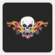 Crânio perverso com presas e chamas e corações cor-de-rosa.