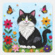 Adesivo Quadrado Cute Black and White Cat, Flowers and Butterflies