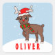 Veado Bonito com o Pau Clássico do Natal do Criança de Natal do Papai Noel. Uma rena bonita com um chapéu vermelho de Papai Noel e fundo azul com flocos de neve brancos. Personalize o adesivo com seu nome.