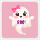 Imagine a charming little ghost, complete with a sweet pink bow and sparkling purple eyes, gently saying "Boo!" in a playful, friendly manner. It’s hard not to smile at such an endearing spirit!