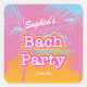 O adesivo favorito "Bach Party" rosa é uma adição divertida para uma festa de solteira com o nome da noiva que está acima em uma fonte de script e data abaixo. O fundo é colorido com cores alegres azuis e amarelas.