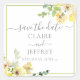 Delicar as flores amarelas da aquarela decoram esta adorável tarde de verão. Salve o adesivo da Data. A design de casamento do jardim é acentuada por uma delicada faixa verde retangular verde e folhas botânicas sob os elegantes peões ensolarados. Floral e leve, perfeito para uma cerimônia ao ar livre.