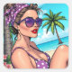 O verão divertido vibe adesivos com uma senhora bonito em um biquíni bolinhas roxo na praia, no estilo de um gibi tropical.