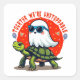 Descubra uma ilustração vibrante e caprichosa que apresenta um fantasma legal em óculos escuros a montar uma tartaruga, rodeada por balões festivos e estrelas. Perfeito para aqueles que acreditam em trabalhos em equipe imparáveis e aventuras divertidas!