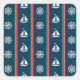 Design náutica com barco à vela e decoração de bússolas em fundo listrado vermelho, azul e branco