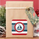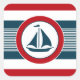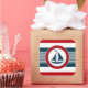 Design náutica com decoração em forma redonda de embarcações à vela, em fundo listrado, a azul, vermelho e branco