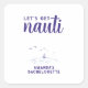 Um adesivo de despedida de solteira com tema náutico que você pode personalizar com o nome. O título: "Let's Get Nauti". Ele apresenta uma impressão de tinta de um pequeno barco a vela, ondas do oceano e alguns pássaros. Moderno, divertido, simples, elegante.