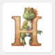 Um dinossauro verde de aparência amigável com cabelo cor de laranja picante está espiando através de uma letra de madeira 'H'.