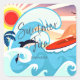 Divertimento de verão, Abaixo. Design Whimsical em cores brilhantes, todas as coisas australianas para diversão na praia: surfar, sol, palmeiras, cangurus, praia arenosa, e um excelente grande sorriso!