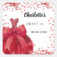 Para uma doce 16, 16ª festa de aniversário. Um fundo branco com confete vermelho, um vestido e um grande arco vermelho. O nome é escrito com um moderno estilo escrito à mão. Personalize e adicione seu nome e uma data.
