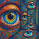 "Ecos na Íris" - Um Retrato Surreal. Um olho ousado e estilizado pintado se multiplica infinitamente em um túnel de reflexões espelhadas, suas cores dançando entre fogo e água. Cada eco se afasta, simbolizando a mudança gradual de identidade ao longo do tempo. A peça funde intensidade pareada com repetição surreal, explorando a beleza e a inquietação do autoexame interminável.