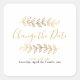 O efeito Dourado deixa e ramifica a data do adesivo quadrado. Altere o selo do envelope de data para seus convidados e convidados. Este adesivo moderno salve o adesivo de mudança com seus nomes e data de casamento com o efeito ouro bonito deixa o embarque "mudar a data" escrito em um roteiro elegante. Observe que o efeito ouro está impresso.