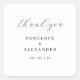 This square sticker features a minimalist and elegant design with a clean white background, creating an open and spacious feel. The phrase "thank you" is written in a flowing cursive script at the top center, suggesting a personal touch, while the names and date below are presented in a simple, classic serif font, adding to the formal aesthetic. The black text on a white background enhances contrast and ensures legibility, making it perfect for expressing gratitude in a sophisticated manner. Ideal for acknowledging special occasions or gestures, this design conveys a mood of appreciation and refinement through its clear typographic hierarchy and absence of visual clutter.